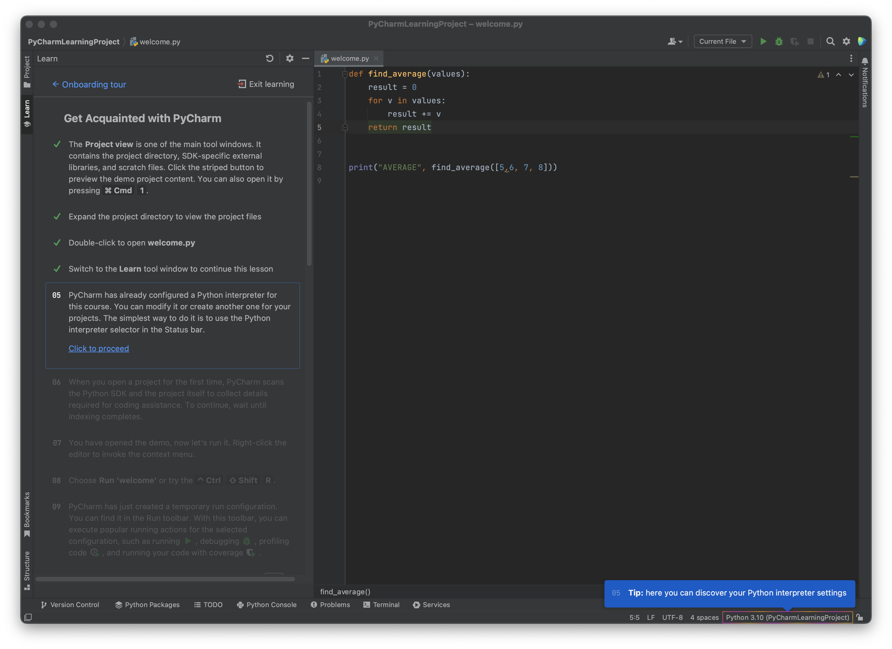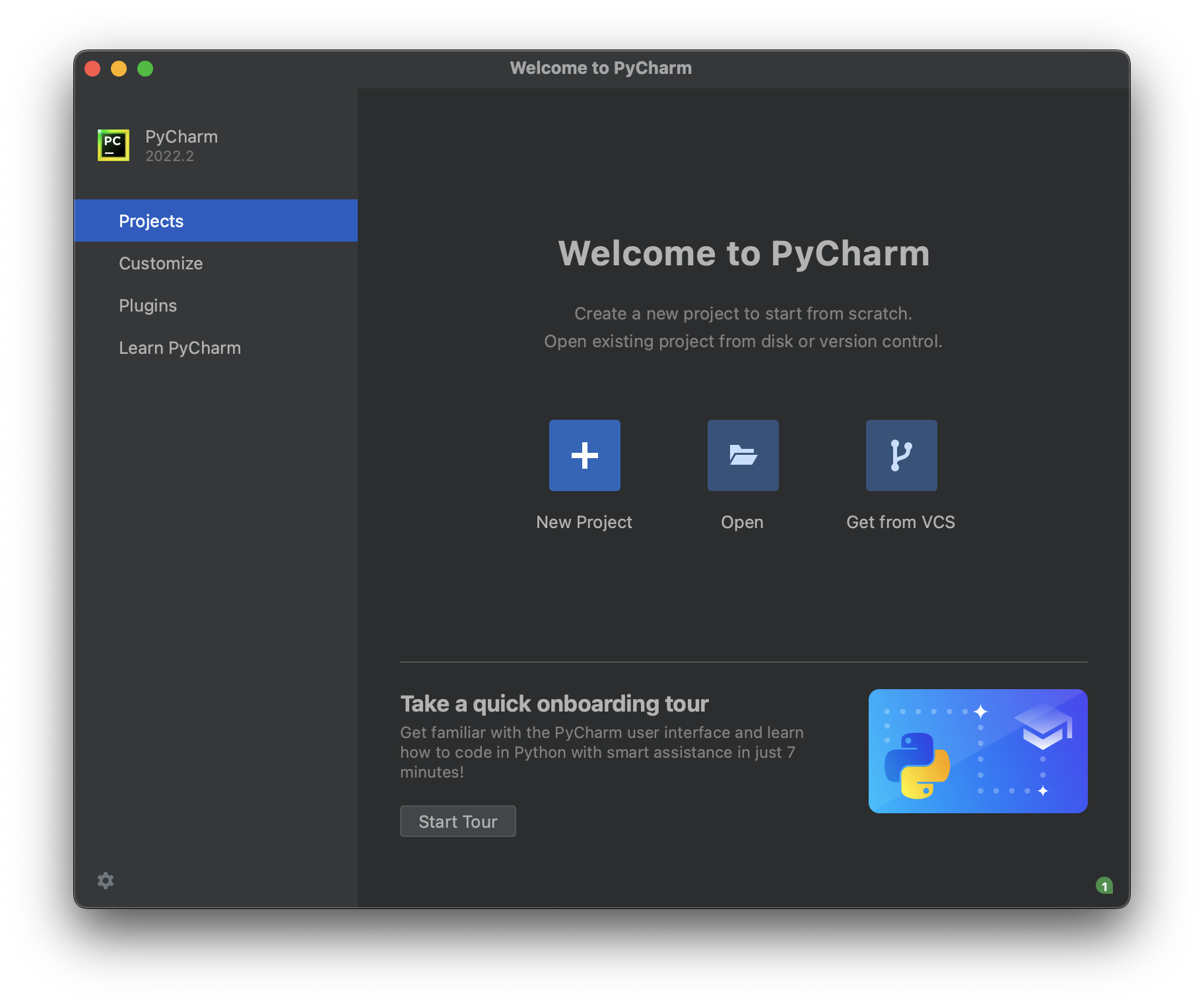 - 처음 실행하면 Welcome to PyCharm 창이 뜨고, 여기서 ‘Start Tour’ 버튼을 클릭해서 기본적인 작동법을 배울 수 있다