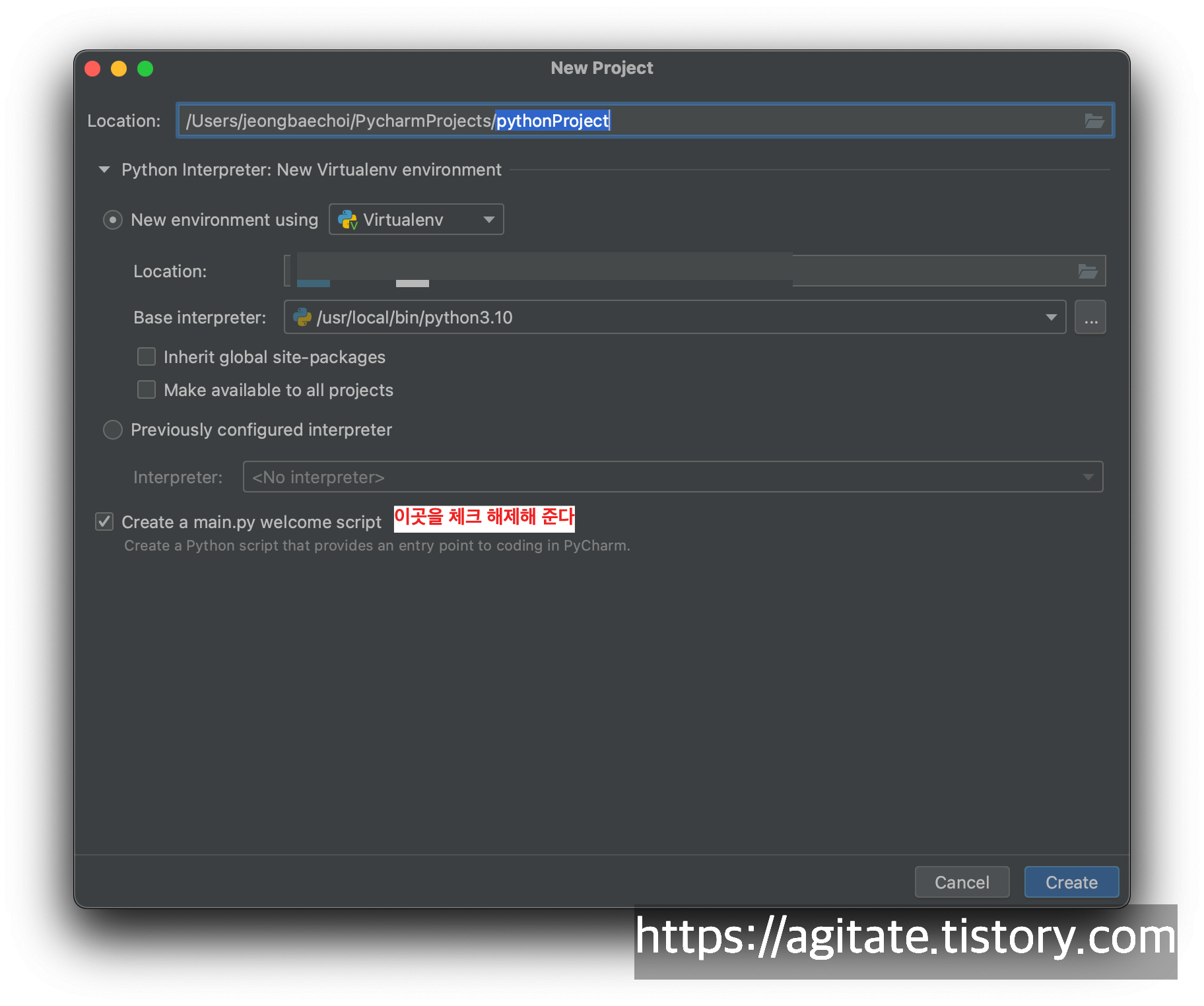 - ‘Create a main.py welcome script’ 체크 해제: 체크할 경우 예시 파일이 생성되므로 불편