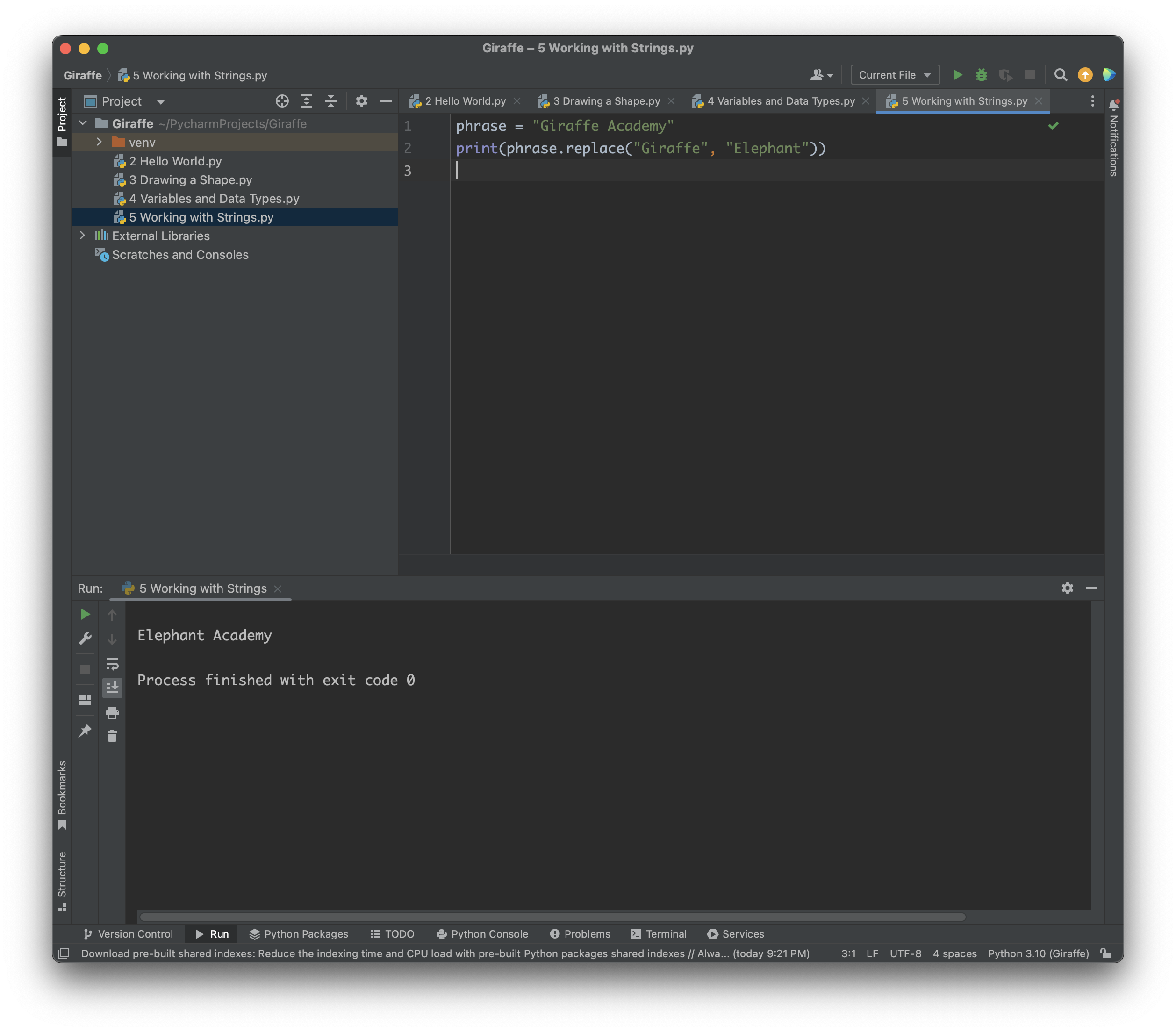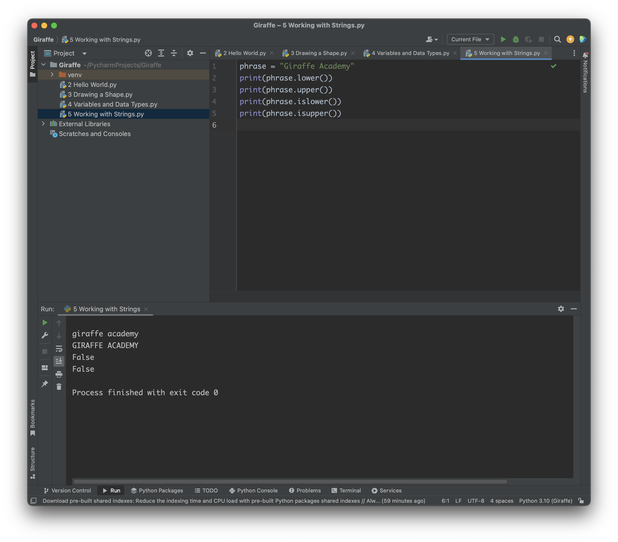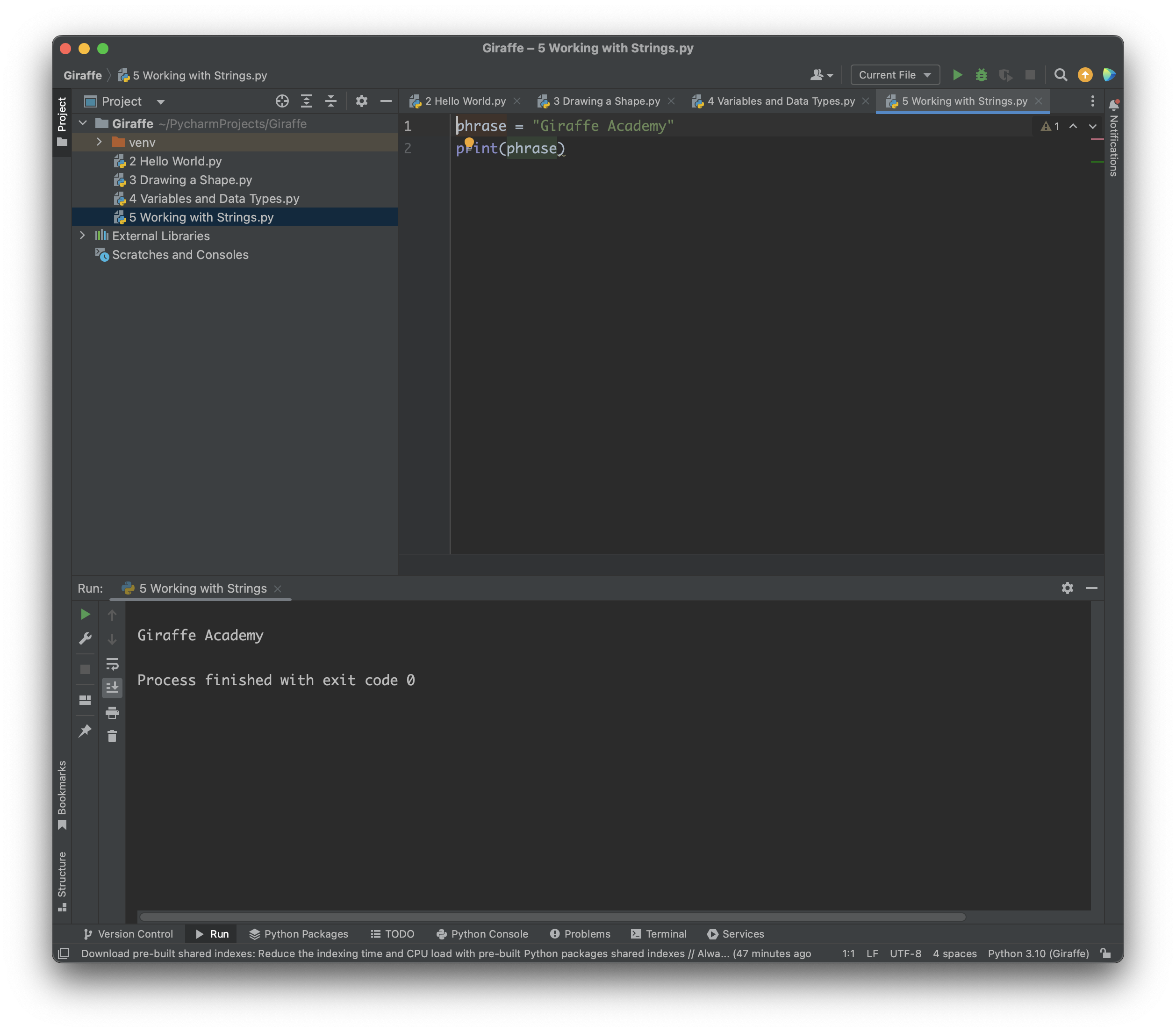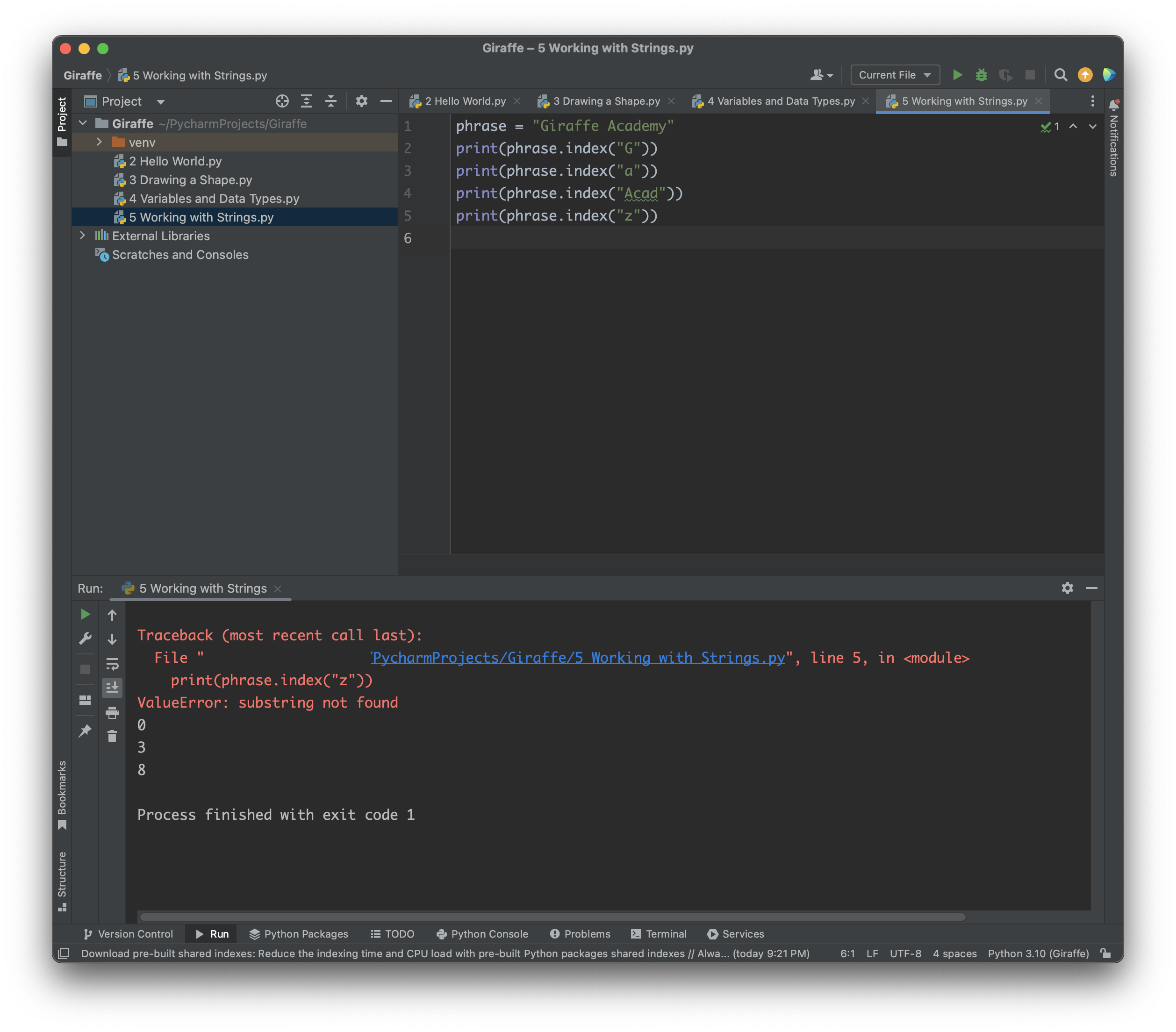 - 파이썬에서는 문자열의 첫 번째 위치가 (1이 아니라) 0에 해당한다는 데 주의한다