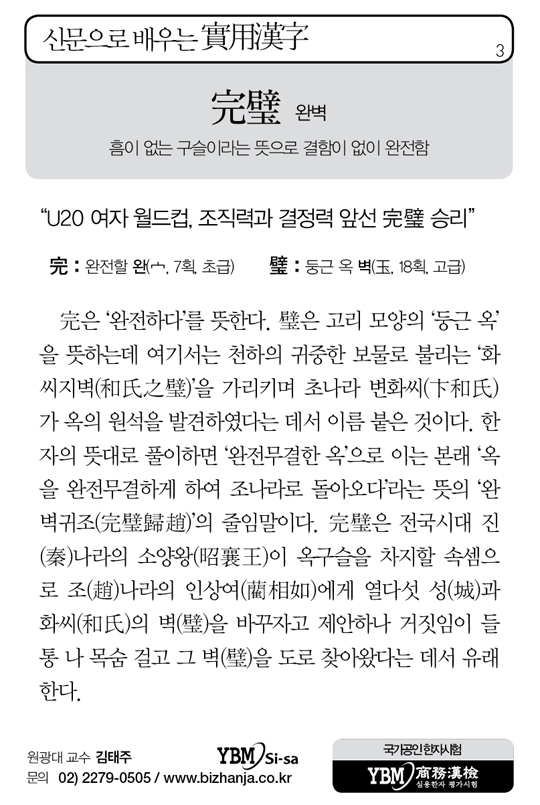 [신문으로 배우는 실용한자] 完 璧 (완벽)