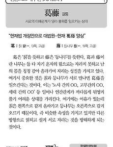 전체보기267 신문으로 배우는 실용한자 (5) 壟斷(농단) 출처: https://www.chosun.com/site/data/html_dir/2010/09/06/2010090601786.html [신문으로 배우는 실용한자] 壟斷 (농단) 신문으로 배우는 실용한자 壟斷 농단 www.chosun.com 2010. 9. 7. 壟斷(농단) 옳지 않은 방법(方法)으로 이익(利益)이나 권리(權利)를 독(獨)차지함 “대통령(大統領) 턱밑에서 국정(國政) 壟斷” 壟과 隴의 대표(代表) 훈(訓)은 각각(各各) ‘밭두둑’과 ‘고개 이름’이지만 여기서는 모두 ‘언덕’이라는 뜻으로 사용(使用)한다. 농단에서 ‘농’을 한자(漢字)로 표기(表記)할 때 壟과 隴은 통용(通用)된다. 斷의 대표 훈은 ‘끊다’지만 여기서는 ‘깎아지르다’라는 뜻으로 사용한다. 즉 壟斷은 ‘깎아지른 듯 높이 솟은.. 2022. 9. 19. 신문으로 배우는 실용한자 (4) 支拂猶豫(지불유예) 출처: https://www.chosun.com/site/data/html_dir/2010/09/05/2010090500845.html [신문으로 배우는 실용한자] 支拂猶豫 (지불유예) 신문으로 배우는 실용한자 支拂猶豫 지불유예 www.chosun.com 2010. 9. 6. 支拂猶豫(지불유예) 전쟁(戰爭)·천재지변(天災地變) 등(等)으로 인(因)해 일정(一定) 기간(期間) 채무이행債務履行)을 미루는 일 “호화(豪華) 청사(廳舍) 논란(論難) ○○시(市), 지자체(地自體) 첫 支拂猶豫 선언(宣言)” 支와 拂의 대표(代表) 훈(訓)은 각각(各各) ‘지탱(支撑)하다’와 ‘떨치다’지만 여기서는 ‘물건(物件) 값이나 셈해야 할 돈을 치르다’로 풀이한다. 猶와 豫의 대표 훈은 각각 ‘오히려’와 ‘미리’지만 여기서.. 2022. 9. 14. 문화관광부 (2007). 영화 및 음악 분야 표절방지 가이드라인 출처: https://www.mcst.go.kr/kor/s_notice/press/pressView.jsp?pSeq=9028 보도자료 - “영화 및 음악분야 표절 방지 가이드라인” 마련 | 문화체육관광부 “영화 및 음악분야 표절 방지 가이드라인” 마련 게시일 2007. 12. 11. 조회수 5486 담당부서 문화산업본부(02-3704-9472) 담당자 최종철 붙임파일 문화관광부(장관:김종민)는 지난 3월 발표한 “저작권 www.mcst.go.kr 문화관광부(現 문화체육관광부)에서 2007년에 발표한 "영화 및 음악 분야 표절 방지 가이드라인"입니다. 표절 판단의 일반적 기준과 함께 영화, 드라마, 음악의 표절 판단 기준에 대해 소개하고 있습니다. 해당 가이드라인에서는 음악의 표절 판단 기준으로 다음을 제.. 2022. 9. 13. 학년별 렉사일 지수(Lexile Measure) 출처: https://hub.lexile.com/lexile-grade-level-charts Lexile & Quantile Hub hub.lexile.com 렉사일 지수(Lexile Measure)는 영어 원서 읽기를 할 때 종종 참고되는 지표 중 하나입니다. 렉사일 지수가 절대적인 기준은 아니겠지만 자신의 어휘 수준에 맞는 책을 고르기 쉽게 해 준다는 장점이 있습니다. 아래 표는 학년별 렉사일 지수를 50백분위수와 90백분위수를 통해 보여준 것입니다. 백분위수(percentile)는 특정 집단에서의 한 개인의 상대적 위치를 나타내는데, 숫자가 클수록 해당 집단 내에서 상대적으로 높은 점수를 받았음을 가리킵니다. 예컨대, 백분위수가 95라면 자신이 속한 집단에서 상위 5%에 해당하는 점수를 받았다는 .. 2022. 9. 11. 신문으로 배우는 실용한자 (3) 完璧(완벽) 출처: http://news.chosun.com/site/data/html_dir/2010/09/02/2010090201990.html [신문으로 배우는 실용한자] 完 璧 (완벽) 신문으로 배우는 실용한자 完 璧 완벽 www.chosun.com 2010. 9. 3. 完璧(완벽) 흠이 없는 구슬이라는 뜻으로 결함(缺陷)이 없이 완전(完全)함 “U20 여자(女子) 월드컵, 조직력(組織力)과 결정력(決定力) 앞선 完璧 승리(勝利)” 完은 ‘완전하다’를 뜻한다. 璧은 고리 모양(模樣)의 ‘둥근 옥(玉)’을 뜻하는데 여기서는 천하(天下)의 귀중(貴重)한 보물(寶物)로 불리는 ‘화씨지벽(和氏之壁)’을 가리키며 초(楚)나라 변화씨(卞和氏)가 옥의 원석(原石)을 발견(發見)하였다는 데서 이름 붙은 것이다. 한자(漢字).. 2022. 9. 8. 신문으로 배우는 실용한자 (2) 帝王切開(제왕절개) 출처: http://news.chosun.com/site/data/html_dir/2010/09/01/2010090101971.html [신문으로 배우는 실용한자] 帝王切開 (제왕절개) 신문으로 배우는 실용한자 帝王切開 제왕절개 www.chosun.com 2010. 9. 2. 帝王切開(제왕절개) 모체(母體)의 배를 가르고 인공적(人工的)으로 태아(胎兒)를 꺼내는 수술(手術) “帝王切開로 낳은 아기, 천식(喘息) 많은 까닭” 帝王切開의 유래(由來)를 모르는 사람들은 대부분 ‘帝王’이라는 어휘(語彙)에서 이 수술이 대단히 좋은 수술이라고 오해(誤解)하기 쉽다. 그러나 제왕절개는 출혈(出血)이 심(甚)하거나 산모(産母)와 태아의 생명(生命)이 위험(危險)에 처(處)해 있는 경우 행(行)해지는 수술이다. 기원전.. 2022. 9. 7. 신문으로 배우는 실용한자 (1) 葛藤(갈등) 출처: news.chosun.com/site/data/html_dir/2010/08/31/2010083101861.html [신문으로 배우는 실용한자] 葛 藤 (칡 갈, 등나무 등) www.chosun.com 2010. 9. 1. 葛藤 갈등 서로의 이해관계(利害關係)가 달라 불화(不和)를 일으키는 상태(狀態) “헌재법(憲裁法) 개정안(改正案)으로 대법원(大法院)-헌재 葛藤 양상(樣相)” 葛은 ‘칡’을 뜻하고 藤은 ‘등나무’를 뜻한다. 葛과 藤이란 나무는 둘 다 자기(自己) 혼자의 힘으로는 자라지 못하고 남의 몸을 칭칭 감아 올라가며 자라는 성질(性質)을 가지고 있다. 여기서 중